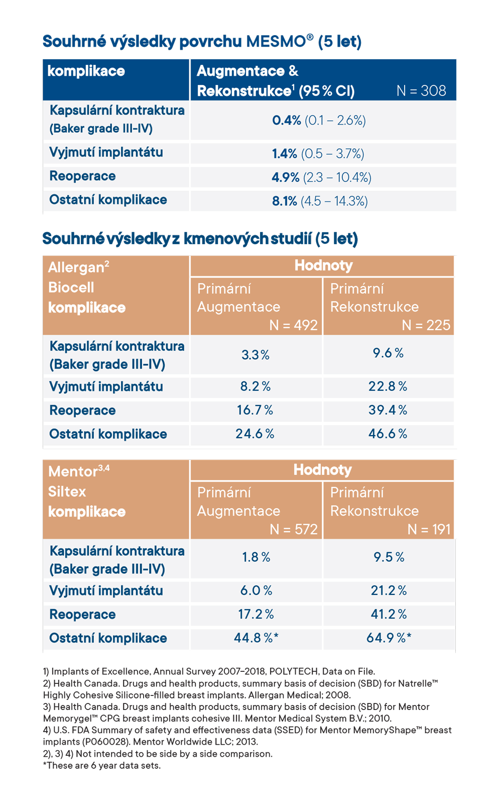 308 pacientek (celkově 609 prsních implantátů) které podstoupily augmentaci nebo rekonstrukci s implantáty MESMO® byly sledovány mezi lety 2011 až 2018. Tato bezpečnostní studie je založena na Kaplan-Meierově analýze o sbírání dat (stejně jako v kmenových studiích).